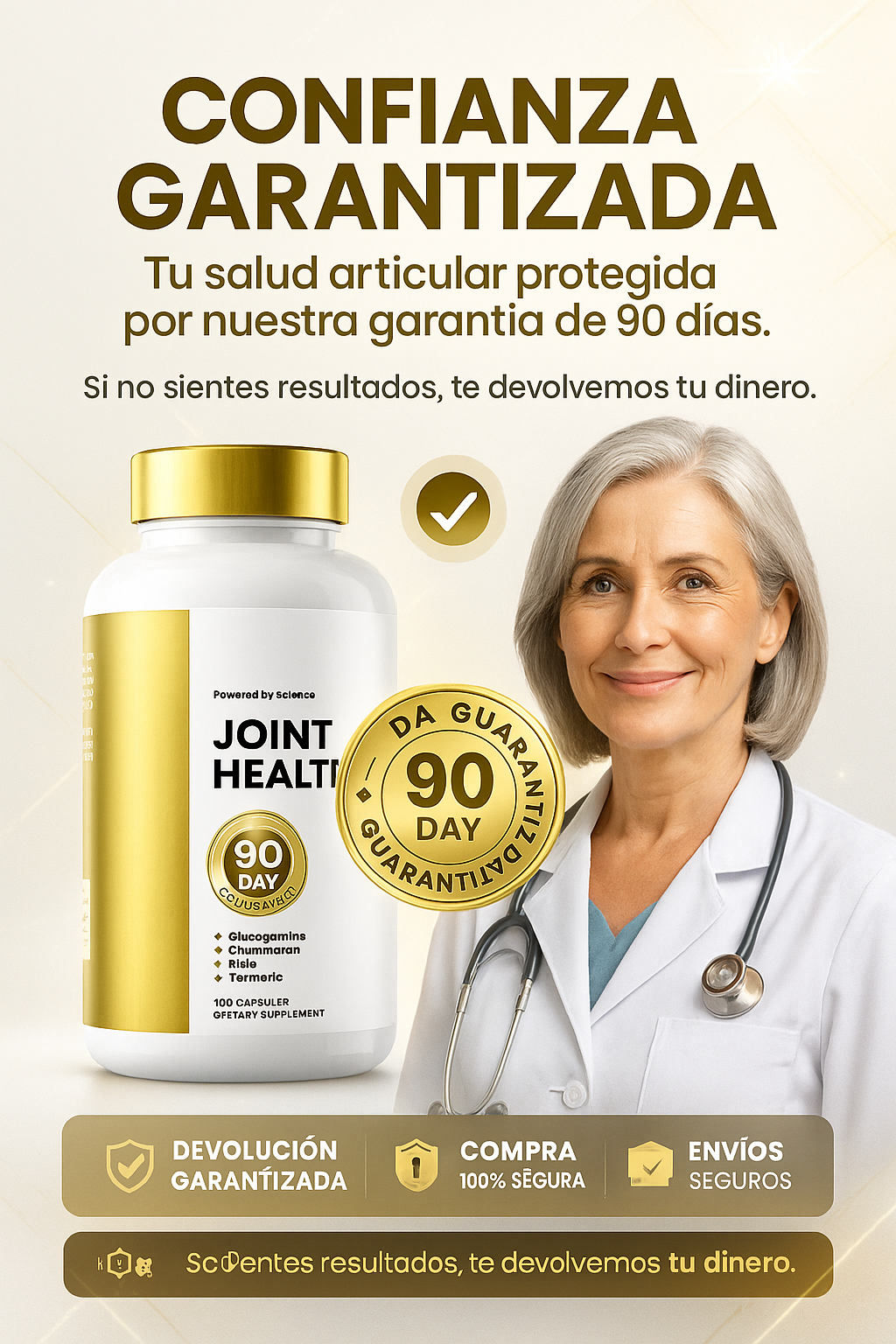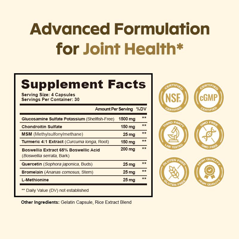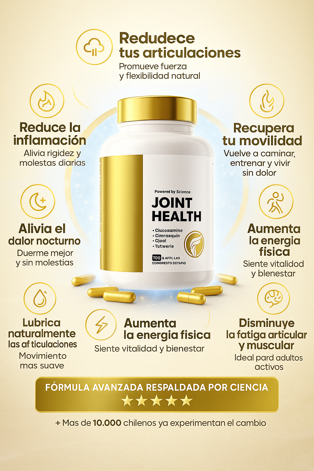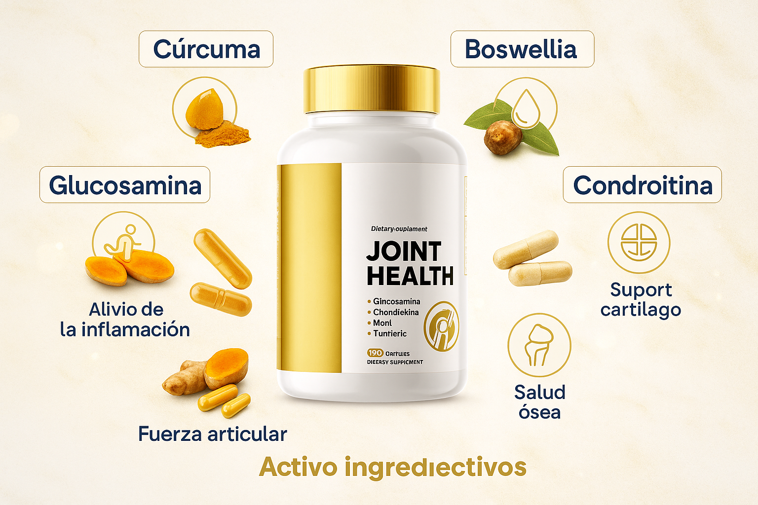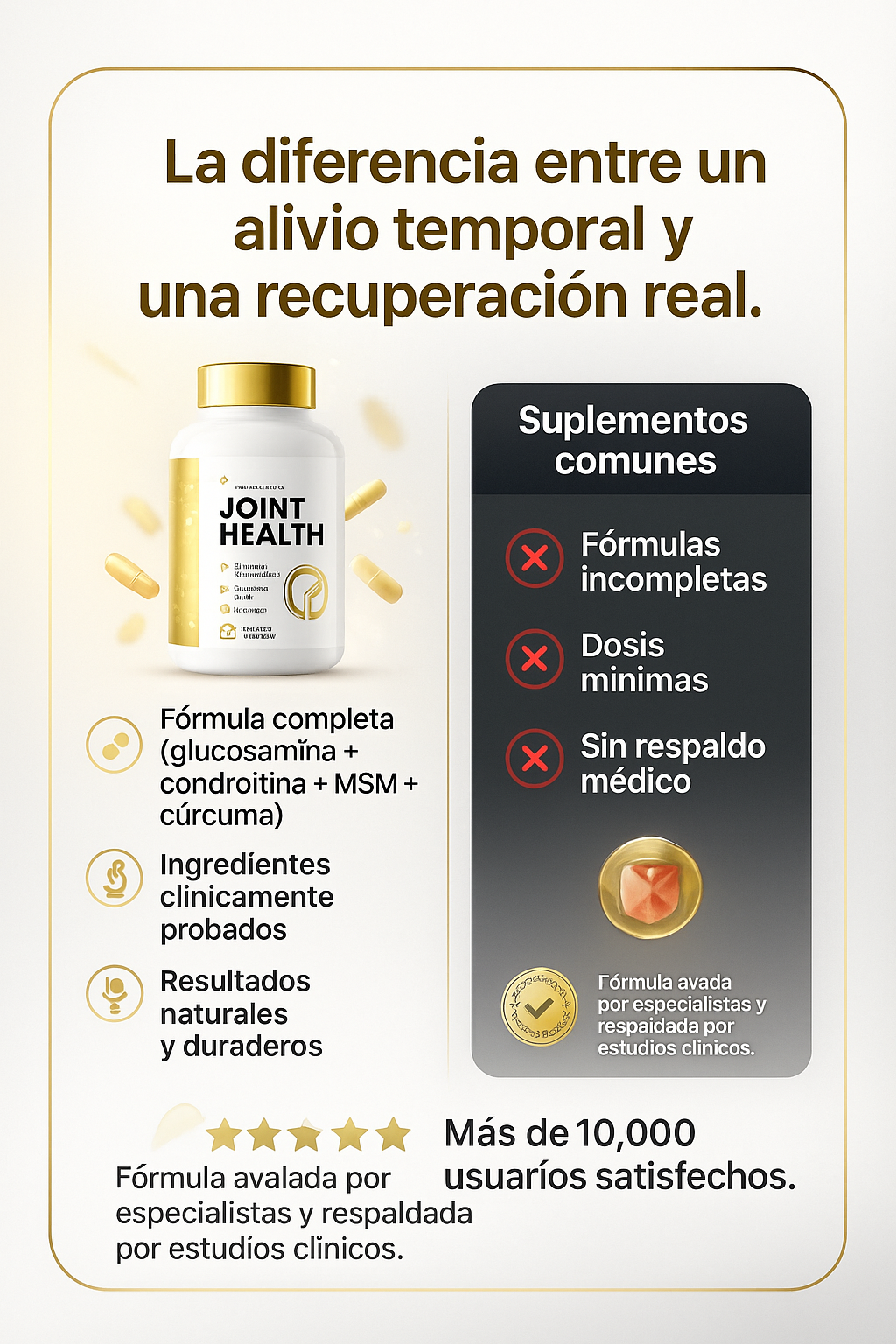 Combinamos cuatro ingredientes clínicamente probadosen dosis óptimas: Glucosamina, Condroitina, MSM y Cúrcuma, para una protección articular total, no solo alivio temporal.